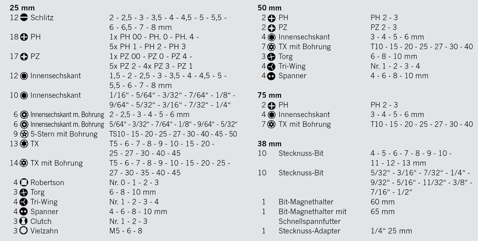 - 25, 50, 75 mm Bits und Steckschlüssel-Bit-Einsätze in einer Box