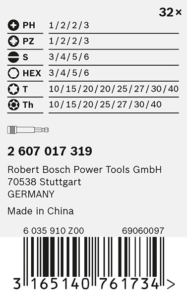| Abmessung: | HEX3, HEX4, HEX5, HEX6, PH1, PH2, PH3, PZ1, PZ2, PZ3, SL3, SL4, SL5, SL6, T10, T15, T20, T25, T27, T30, T40, TH10, TH15, TH20, TH25, TH27, TH30, TH40 |