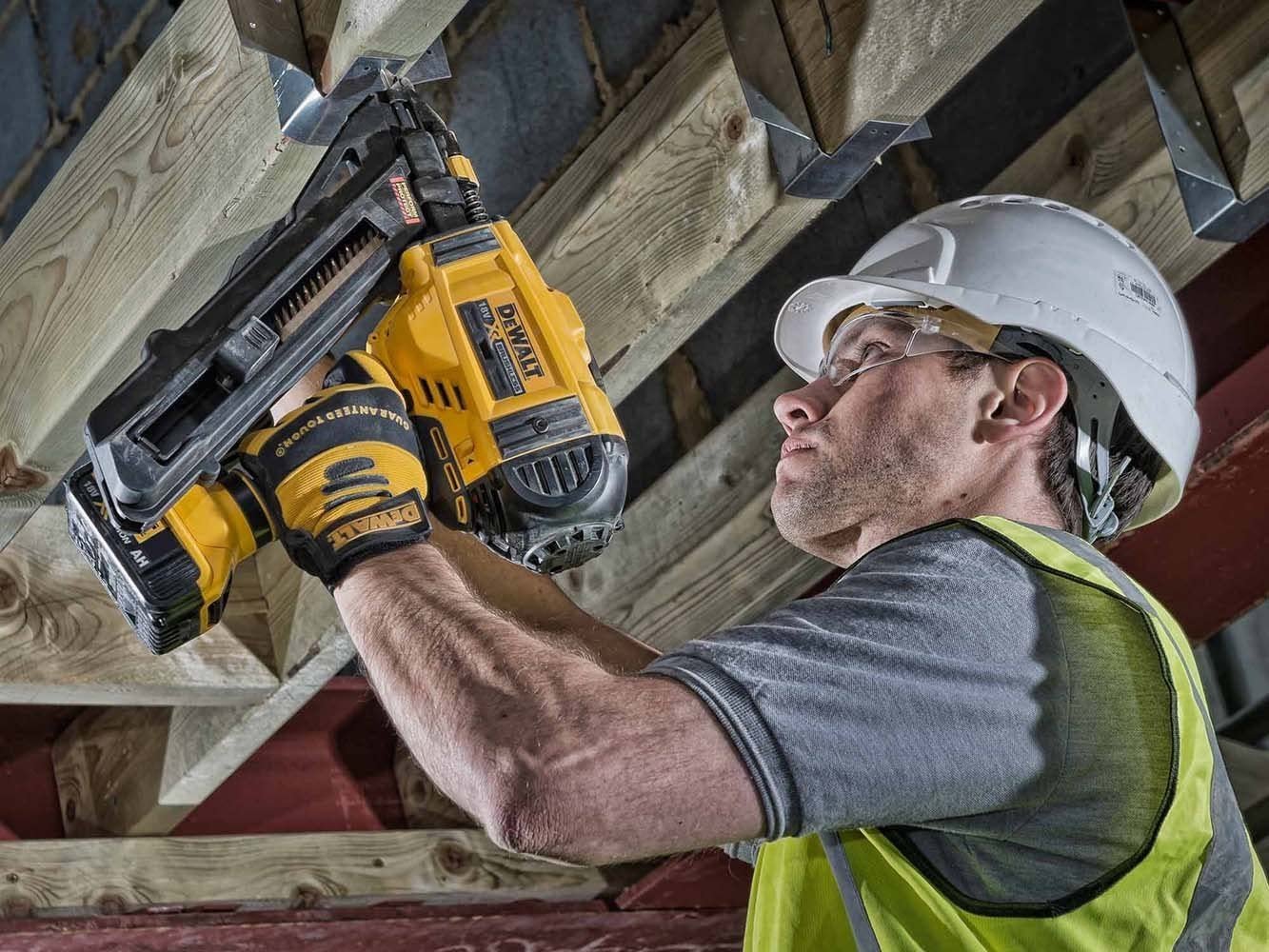 18 Volt Akku-Ankernagler (bürstenlos) - BasisversionProduktstärken:Leistungsstarker 18 Volt Akku-Ankernagler, zur schnellen, punktgenauen Befestigung von MetallverbindernBürstenlose Motor-Technologie für höhere Leistung, kompaktere Abmessungen sowie längere LebensdauerSpezielle Zentrierspitze für eine sehr genaue NagelpositionierungGeeignet für 4 mm Nägel mit Längen von 40 - 60 mmPräzise und werkzeuglose TiefeneinstellungEinschlagenergie in 2 Stufen für materialgerechte und nagelspezifische Arbeiten einstellbarSichere Kontaktauslösung, wahlweise mit Einzelschuss oder Einzelauslösung mit Sicherungsfolge und damit ideal für SerienbefestigungenAkkukontrollleuchte für mehr Sicherheit von Anwender und MaschineSchusskanal Kontrollleuchte warnt bei einem blockierten Nagel im SchusskanalWerkzeugloses Lösen des Schusskanals für eine schnelle Entnahme blockierter NägelSerienmäßig als Basistype (ohne Akkus und Ladegerät) optimal geeignet bei bereits vorhandenen 18 Volt oder 54 Volt XR FLEXVOLT-AkkusLieferumfang:Drehbarer Gürtel- / LeiterhakenTechnische Daten:Akku-Technologie: 18 Volt XRNageltyp: AnkernägelNagellänge (mm): 40 - 60Nagel-Ø (mm):3,4 - 4,0Magazinwinkel (Grad): 33Magazinkapazität (Nägel): 29Gewicht (inkl. 2 / 5 Ah-Akku; kg): 4,0 / 4,2EAN: 5035048468708Triaxiale Vibration (m/s²): 2,5Unsicherheitsfaktor K1 (m/s²): 1,5Schalldruckpegel LPA (dB(A)): 87Schalleistungspegel LWA (dB(A)): 98Unsicherheitsfaktor (dB(A)): 3Garantieumfang:DEWALT Garantie: 1 Jahr