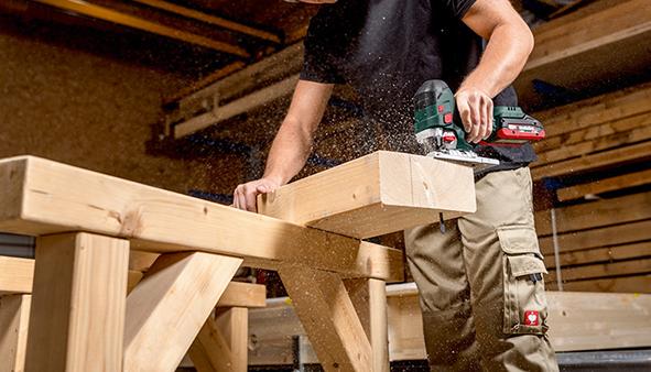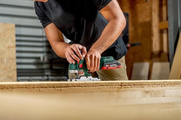 Kraftvolle Akku-Stichsäge mit robustem Aluminiumdruckguss-Getriebegehäuse und tiefliegender Sägeblattführung für exakte Schnitte, ausrissfrei und oberflächenschonend durch Schutzplatte und Spanreißschutz.