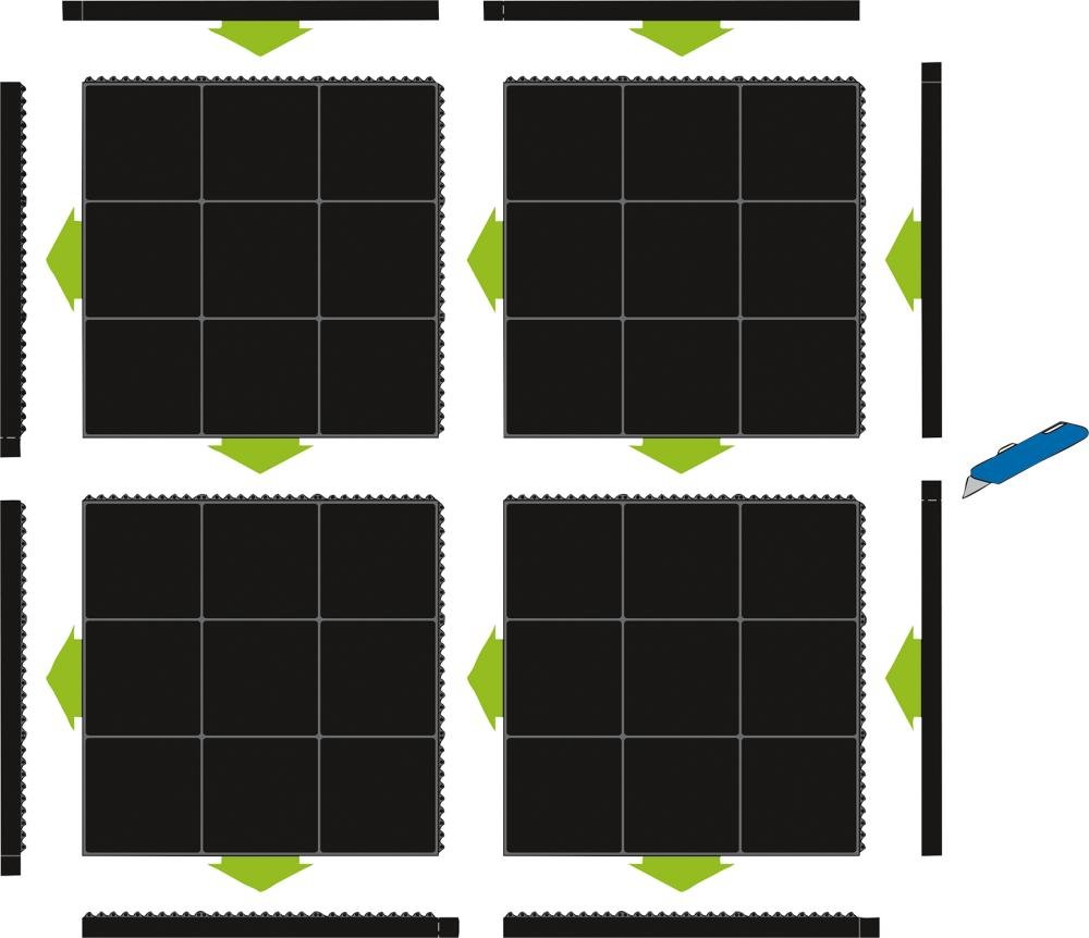 • In Verbindung mit Leisten und Ecken ist Bodenbelag befahrbar (Sackkarren, Handwagen usw.)