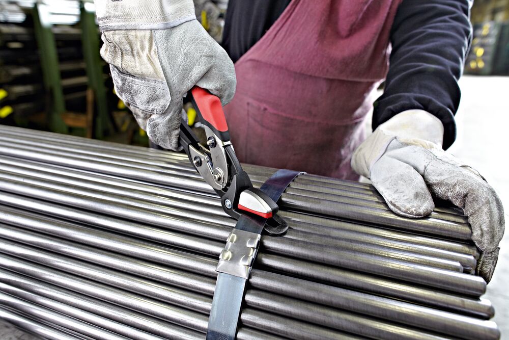 Einsatz sogar bei gehärteten Stahlbändern (560 N/mm²) mit Bandbreite bis 32 mm, Bandstärke bis 1 mm