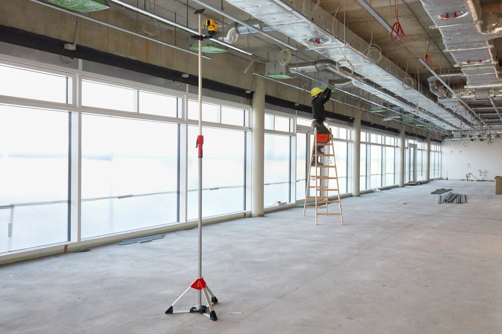 Deckenstützen lassen sich auch ohne obere Verspannung frei im Raum platzieren und sind damit auch im Außenbereich einsetzbar