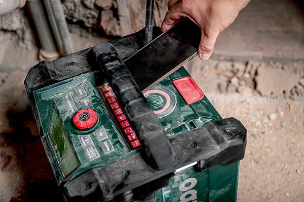 Leistungsstarkes Baustellenradio mit DAB+ Empfang, sattem Sound und integrierter Ladefunktion von Akkus und Smartphones/Tablets.