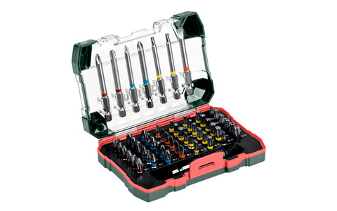 Bits aus Chrom-Vanadium-Stahl (S2-Qualität); Bits mit Farbcodierung: für ein schnelles und einfaches Auffinden des passenden Bits; Magnetischer Schnellwechseladapter; Hochwertige, robuste Box im speziellen Metabo-Design mit ausziehbarem Euroloch-Aufhänger