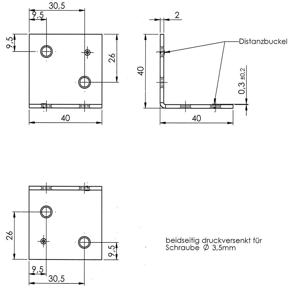 | A x A x B x Stärke: | 30 x 30 x 30 x 2 mm |
