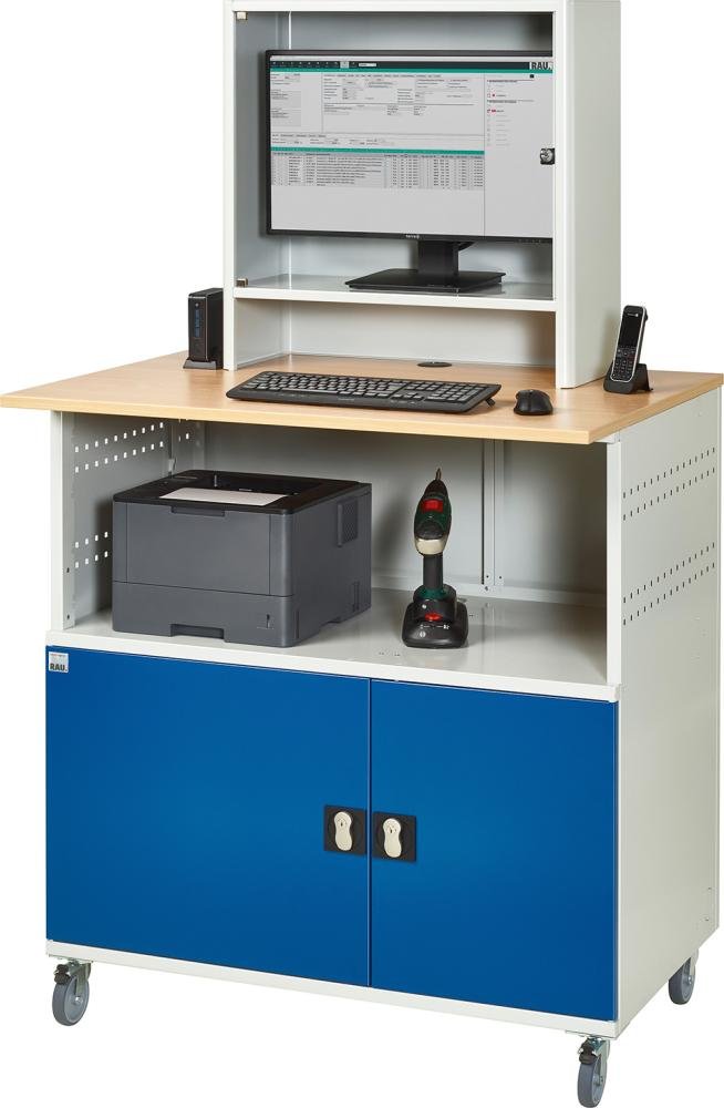 Computer-Tisch B1100xT800xH1810 mm RAL 7035/5010 mobil Gehäuse offen