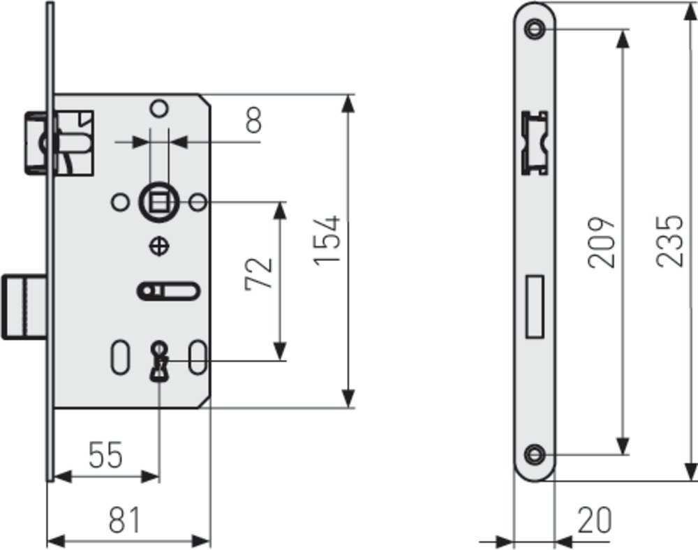 UNIVERSELLES EINSTECKSCHLOSS Beim Zuziehen der Tür wird ausschließlich die Falle betätigt. Durch Verschließen mittels Buntbartschlüssel wird der Riegel ausgeschlossen (eintourig).
