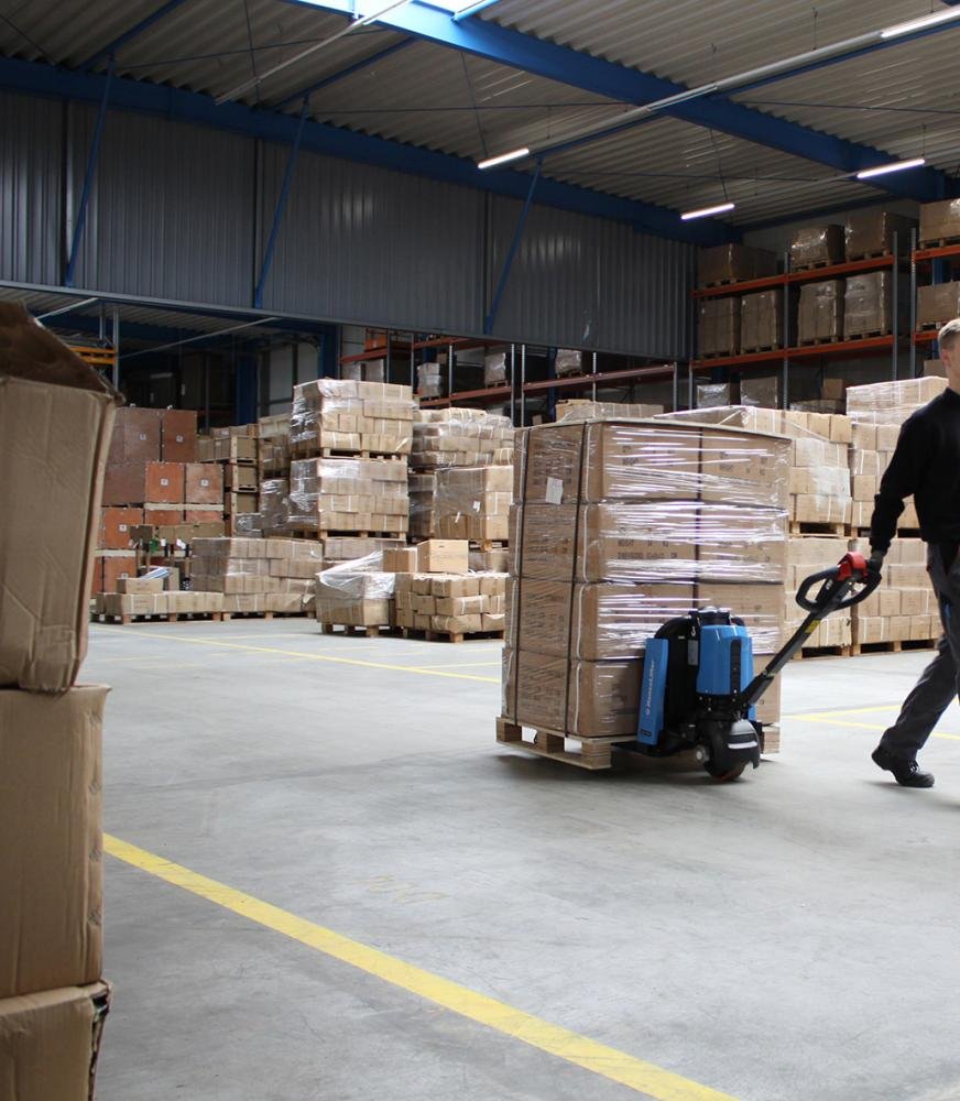 Mit dem leichten Elektrogabelhubwagen lassen sich Paletten elektrisch heben und bewegen.