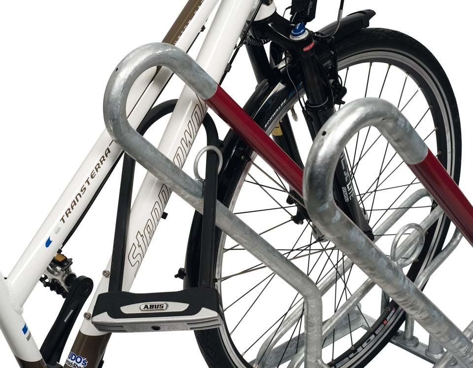 An den Anlehnparker können Fahrräder abwechselnd in Tief-/Hocheinstellung platzsparend abgestellt werden. Der funktionelle Anlehnbügel schützt das Fahrrad gegen mutwilliges Umdrücken.