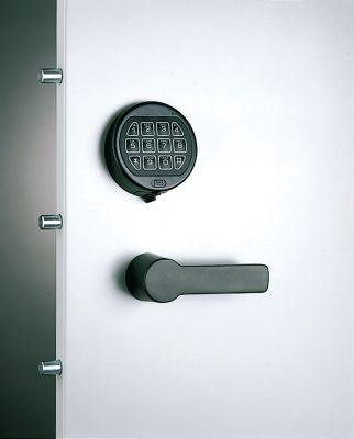 • Gehäuse: allseitig doppelwandig (zwischen den Wandungen 25 mm starke Spezial-Isolierplatten, Klasse A1, nicht brennbar nach DIN 4102), Schutz vor leichten Bränden und Einbruchversuchen