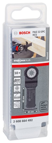 Das Tauchsägeblatt Starlock PAIZ 32 EPC ermöglicht tiefe Schnitte in Holz. Seine Länge von 60 mm erhöht die Reichweite für ausgedehnte Schnitte. Die direkte Kraftübertragung und das robuste Starlock-Aufnahmesystem reduzieren Lateralschwingung und ermöglichen größere geführte Schnitte. Wegen dieses Merkmals ist dieses Produkt ideal geeignet für Tauchschnitte in Weichholz, das Sägen von Aussparungen in Möbelbauteile, das bündige Ablängen von Holzbauteilen und das Durchtrennen von massivem Weichholz. Die abgerundete Blattspitze (Curved-Tec) erleichtert das Anfertigen präziser und glatter Tauchschnitte Das System Starlock Plus ermöglicht sehr schnelle, tiefe und vielfältige Tauchschnitte. Zusätzlich ermöglicht das Starlock-Aufnahmesystem schnellen Blattwechsel in drei Sekunden ohne Blattberührung. Das spezielle Starlock-Aufnahmesystem ermöglicht durch seine dreidimensionale enge Passung maximale Kraftübertragung zwischen Maschine und Zubehör.