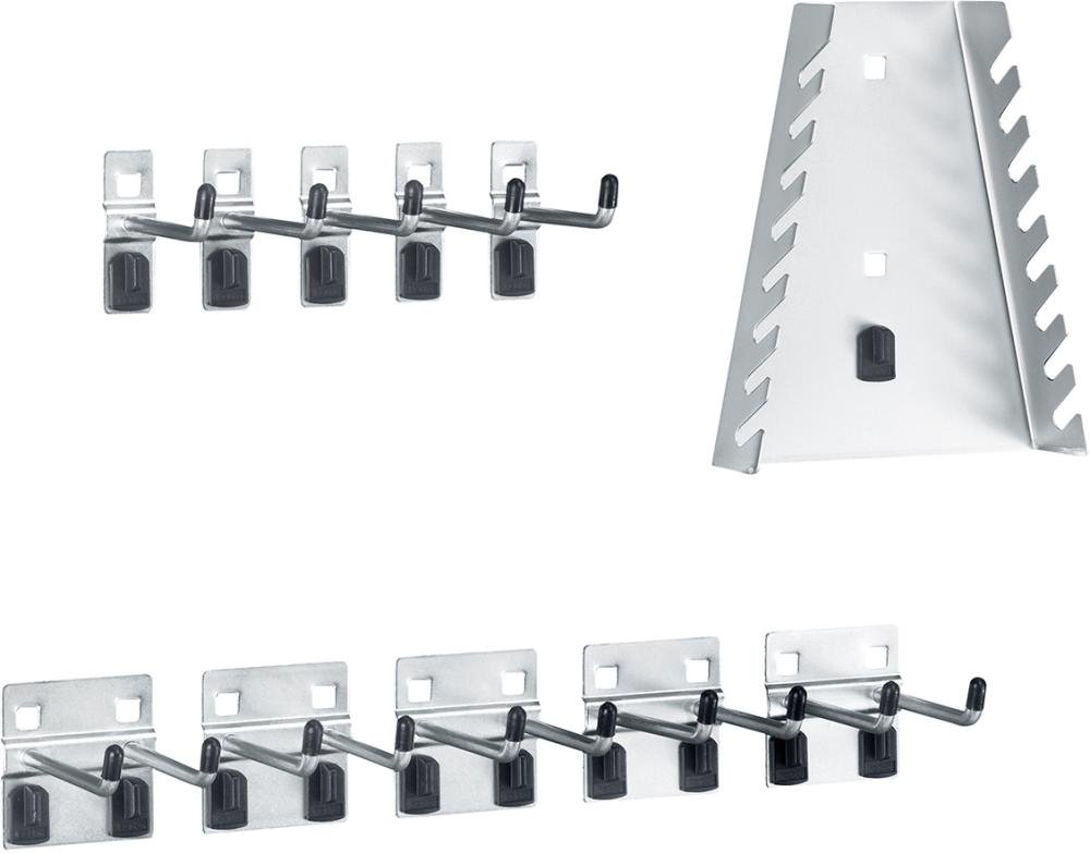 • Bestehend aus: 5 Haken T 75 mm, 5 Doppelhaken T 75 mm, 1 Schraubenschlüsselhalter