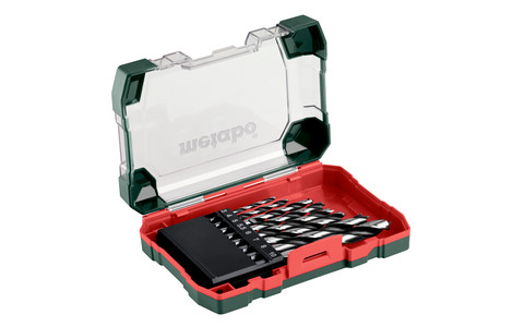 8-teilig, in hochwertiger, robuster Kunststoffkassette im speziellen Metabo-Design mit ausziehbarem Euroloch-Aufhänger; Holzspiralbohrer aus hochwertigem Chrom-Vanadium-Stahl, gehärtet, mit Zentrierspitze für den Einsatz in Hart- und Weichholz, Sperrholz, Spanplatten usw