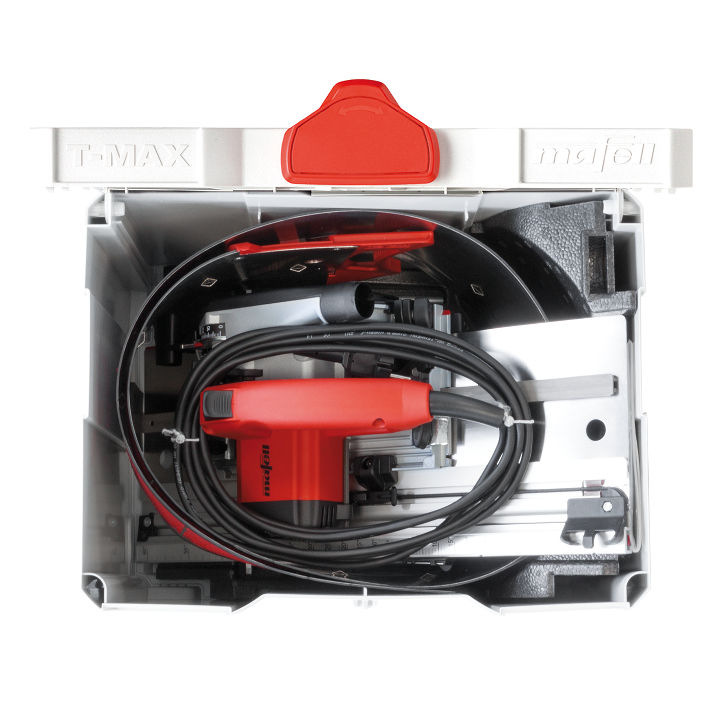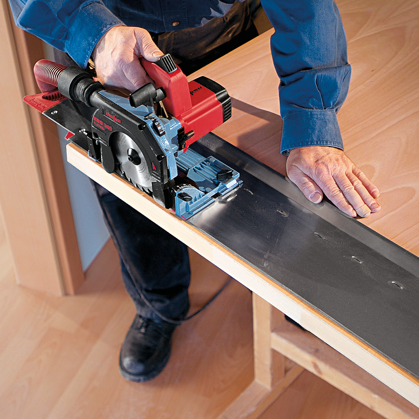 Beim Innenausbau kommt es vor allem auf eines an: Präzision. Deshalb konzentriert sich die Kappschienen-Säge KSS 300 hier durch perfektes Handling auf alle wichtigen Funktionen. Durch die feste Verbindung per Schnellverschluß von Handkreissäge mit KSS-Kappschiene ergibt sich eine hochfunktionelle Einhand-Kappschienen-Säge für Neigungs- und Gehrungsschnitte. Ein Rückholzug bringt die KSS 300 nach jedem Schnitt wieder in die Ausgangsposition. Die 42er Handkreissäge sorgt in allen Situationen für Power und bleibt dank Magnesium-Druckguss mit 2,4 kg besonders handlich und federleicht. Alles zusammen im T-MAX-Transportkoffer ergibt ein kompaktes Sägesystem - ideal für Schattenfugen, Längs-, Schräg-, Tauch- und Winkelschnitte oder auch für Freihandschnitte.