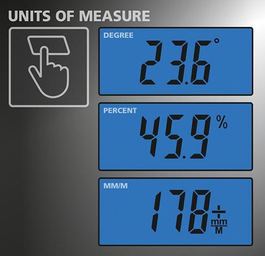 • Anzeige in Grad, Prozent, mm/m, in/ft