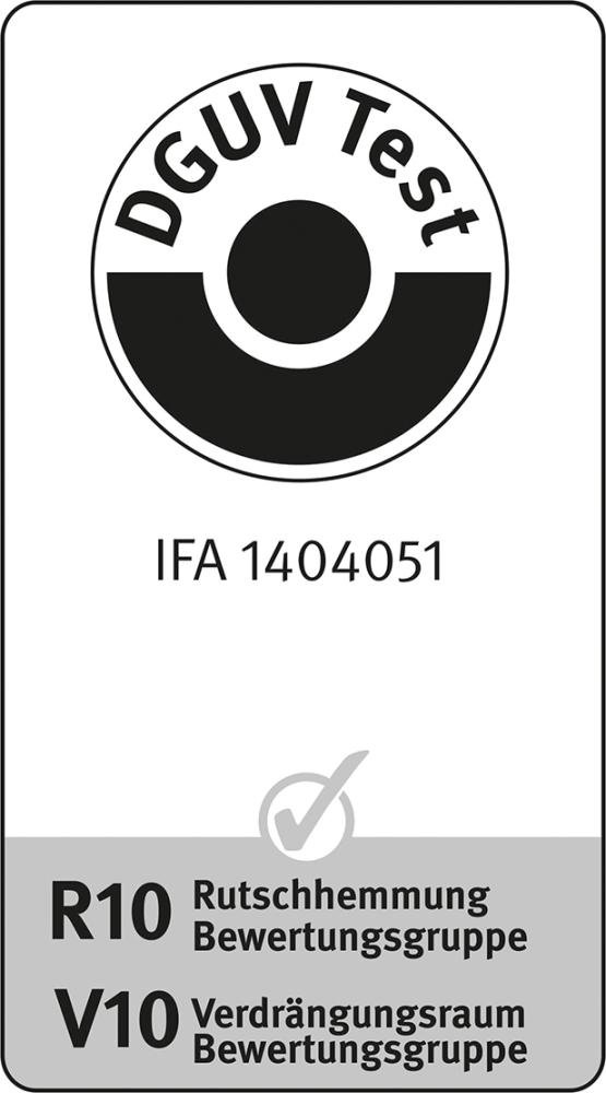 • Rutschhemmung R10: nach DIN 51130 und Verdrängungsraum V10 nach DIN 51130