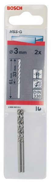 Metallbohrer HSS-G, DIN 338, 3 x 33 x 61 mm, 2er-Pack