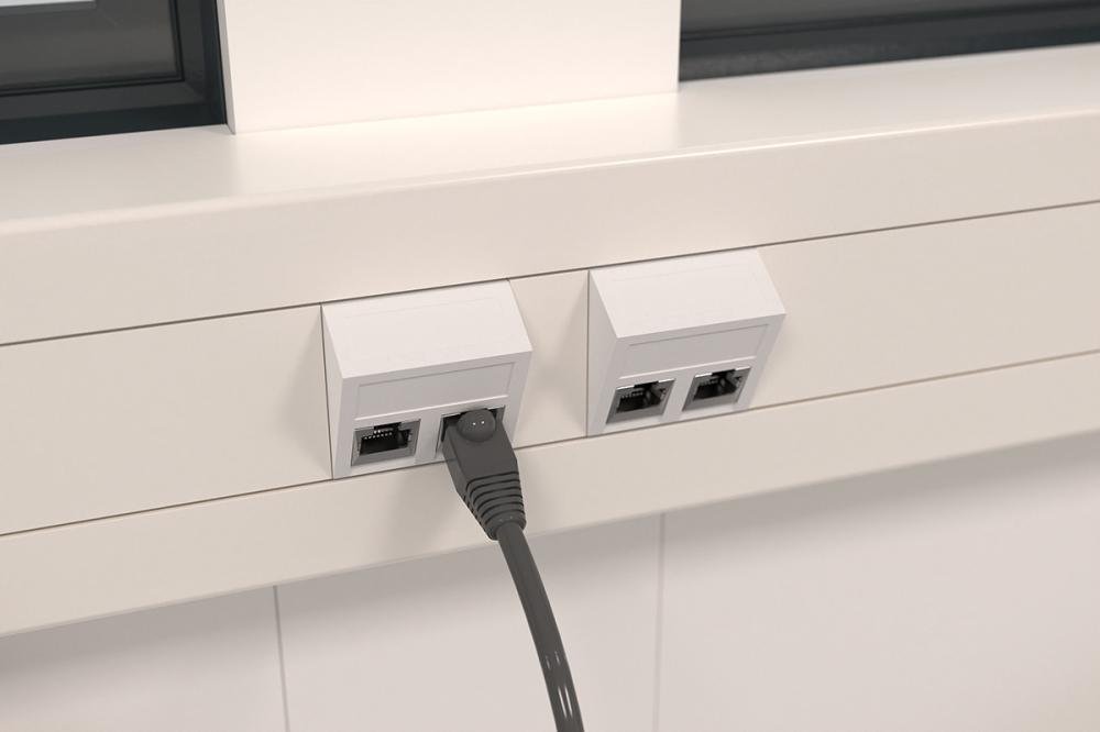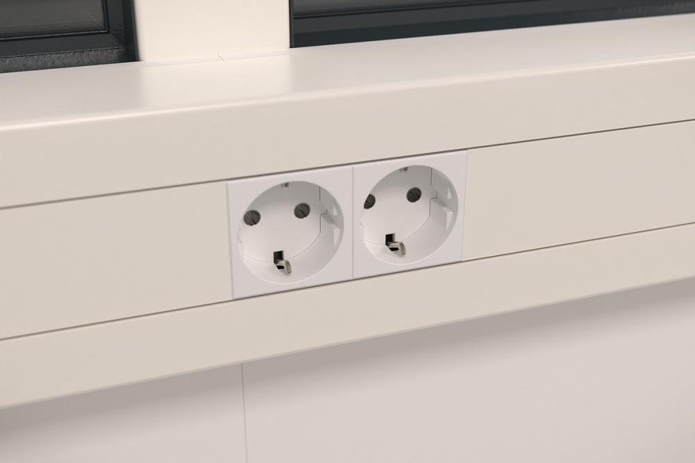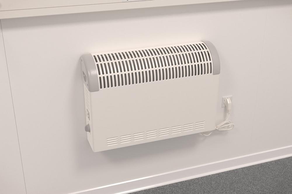 2 LED-Deckenunterbauleuchte, 2 Netzwerkdosen, 4x Zweifach-Steckdosen, 3-reihig bestückbar mit max. 36 Automaten, Elektrowandkonvektor 1 x 2 kw mit stufenlosem Temperaturwähler und Thermostat