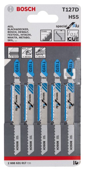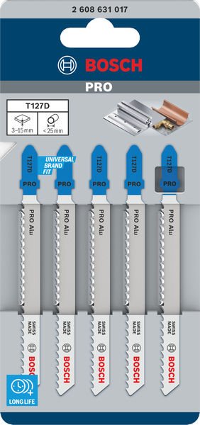 Herausragende Lebensdauer beim Schneiden von Aluminium! Hochgeschwindigkeitsstahl (HSS) für Festigkeit und Hitzebeständigkeit Du bist Metallarbeiter und benötigst ein langlebiges Stichsägeblatt, um Aluminium schnell zu schneiden? Dann ist das PRO Alu T127D für dich die richtige Wahl. Wir haben es entwickelt, damit du schnelle Schnitte in Werkstücke mit einer Dicke von bis zu 15 mm erzielen kannst – immer und immer wieder. Das PRO Alu T127D Stichsägeblatt ist eine herausragende, langlebige Ergänzung für jede Metallwerkstatt. Es wurde aus Schnellarbeitsstahl (HSS) hergestellt, um die Stabilität und Hitzebeständigkeit zu gewährleisten, die du beim Schneiden von Aluminium und anderen Nichteisenmetallen benötigst. Wir haben es mit gefrästen, geschränkten Zähnen und ovalen Spanräumen versehen, um einen gleichmäßigen Schnitt zu gewährleisten. Schneide damit Aluminiumbleche mit einer Dicke von 3 bis 15 mm, Rohre und Profile mit einem Durchmesser von bis zu 25 mm.