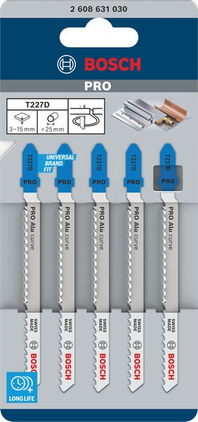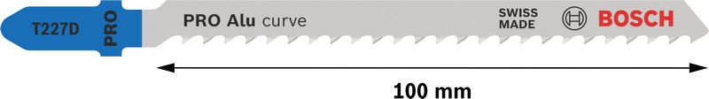 Herausragende Lebensdauer beim Schneiden von Aluminium! Hochgeschwindigkeitsstahl (HSS) für Festigkeit und Hitzebeständigkeit Du bist Metallarbeiter und benötigst ein langlebiges Stichsägeblatt für Kurvenschnitte in Aluminium und Nichteisenmetalle? Dann ist das PRO Alu curve T227D die richtige Wahl. Wir haben es entwickelt, damit du Werkstücke mit einer Dicke zwischen 3 und 15 mm schneiden kannst – immer und immer wieder. Das PRO Alu curve T227D Stichsägeblatt ist eine großartige und langlebige Ergänzung für jede Metallwerkstatt, in der Kurvenschnitte in Aluminium durchgeführt werden müssen. Es wurde aus Schnellarbeitsstahl (HSS) hergestellt, um die Stabilität und Hitzebeständigkeit zu gewährleisten, die du beim Schneiden von Aluminium und anderen Nichteisenmetallen benötigst. Wir haben es mit gefrästen, geschränkten Zähnen und ovalen Spanräumen versehen, um einen gleichmäßigen Schnitt zu gewährleisten. Schneide damit Aluminiumbleche mit einer Dicke von 3 bis 15 mm, Rohre und Profile mit einem Durchmesser von bis zu 25 mm.