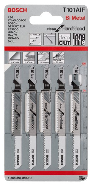 Herausragende Lebensdauer in Hartholz! Bi-Metall Blatt: Kombiniert harte Zähne mit flexiblem Blattkörper Bist du Tischler und auf der Suche nach einem Stichsägeblatt zum Schneiden von Hartholz? Ein Stichsägeblatt, das gerade, saubere Schnitte liefert? Mit dem PRO Hardwood clean T101AIF kannst du diese Arbeit erledigen. Das PRO Hardwood clean T101AIF Stichsägeblatt wurde aus BI-Metall hergestellt: Es verfügt über eine Zahnleiste aus Schnellarbeitsstahl (HSS), die mit einem Körper aus Kohlenstoffstahl (HCS) verbunden ist, um sicherzustellen, dass du Hartholz problemlos bearbeiten kannst. Das Blatt hat eine konische Form und eine feine Zahnteilung für saubere Schnitte, ohne hängen zu bleiben. Schneide damit massives Hartholz mit einer Dicke zwischen 2 und 30 mm.