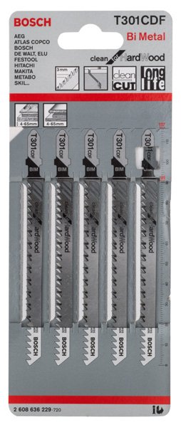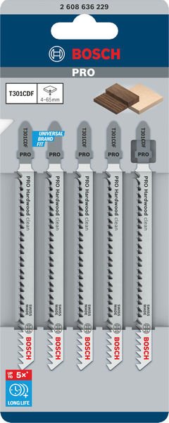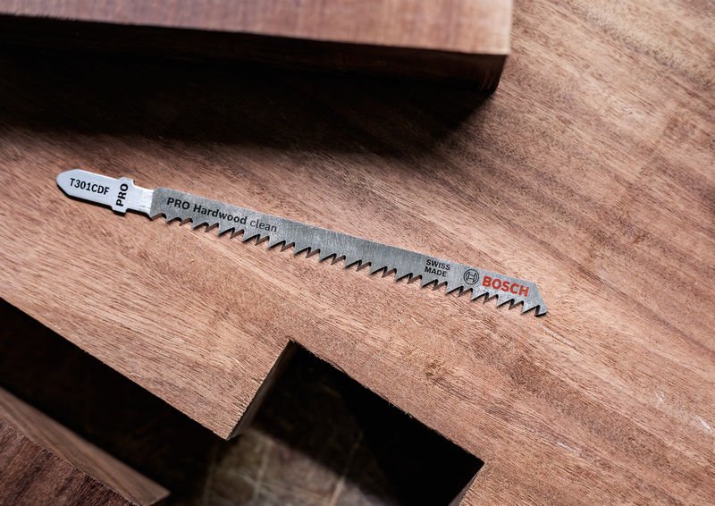 Herausragende Lebensdauer in Hartholz! Bi-Metall Blatt: Kombiniert harte Zähne mit flexiblem Blattkörper Bist du Tischler und auf der Suche nach einem Stichsägeblatt zum Schneiden dickerer Werkstücke aus Hartholz? Ein Stichsägeblatt, das gerade, saubere Schnitte liefert? Mit dem PRO Hardwood clean T301CDF kannst du diese Arbeit erledigen. Das PRO Hardwood clean T301CDF Stichsägeblatt wurde aus BI-Metall hergestellt: Es verfügt über eine Zahnleiste aus Schnellarbeitsstahl (HSS), die mit einem Körper aus Kohlenstoffstahl (HCS) verbunden ist, um sicherzustellen, dass du Hartholz und abrasive Holzwerkstoffe problemlos bearbeiten kannst. Das Blatt hat eine konische Form und eine mittere Zahnteilung für saubere Schnitte, ohne hängen zu bleiben. Dank der erweiterten Länge kannst du massives Hartholz mit einer Dicke zwischen 4 und 65 mm schneiden.