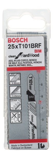 Herausragende Lebensdauer in Hartholz! Bi-Metall Blatt: Kombiniert harte Zähne mit flexiblem Blattkörper Die meisten Stichsägeblätter schneiden nach oben, Das langlebige PRO Hardwood clean reverse T101BRF bietet eine einfache Lösung für Profis, die während der Arbeit die Oberseite ihres Werkstücks sehen und gleichzeitig saubere Schnitte erzielen wollen: Es hat eine entgegengesetzte Zahnform und schneidet nach unten. Das PRO Hardwood clean reverse T101BRF Stichsägeblatt wurde aus BI-Metall hergestellt: Es verfügt über eine Zahnleiste aus Schnellarbeitsstahl (HSS), die mit einem Körper aus Kohlenstoffstahl (HCS) verbunden ist, um sicherzustellen, dass du Hartholz‑ und Laminatbretter problemlos für lange Zeit bearbeiten kannst. Das Blatt hat eine konische Form und eine feine Reverse-Zahnteilung, mit dem du ausrissfreie Schnitte auf der Oberseite von Werkstücken mit einer Dicke von bis zu 30 mm erzielen kannst.