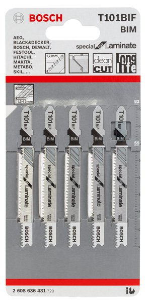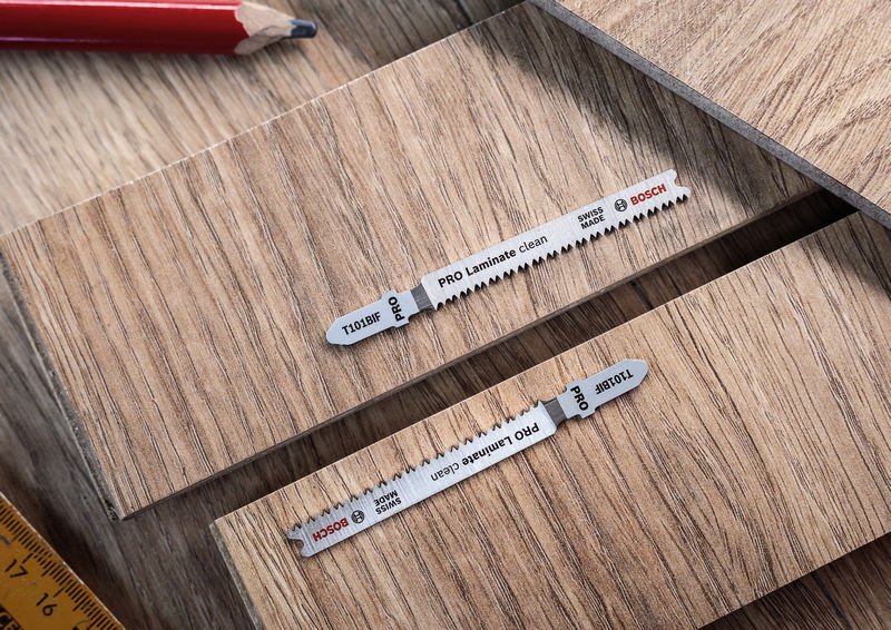 Herausragende Lebensdauer in Laminat! Bi-Metall Blatt: Kombiniert harte Zähne mit flexiblem Blattkörper Beim Schneiden von Laminat mit einer Stichsäge sind grobe Schnitte und Grate an den Kanten ein großes Ärgernis. Das PRO Laminate clean T101BIF ist die Lösung. Damit erzielst du gerade, saubere Schnitte in Hartholz und Laminat mit einer Dicke von bis zu 15 mm. Das PRO Laminate clean T101BIF Stichsägeblatt aus BI-Metall (BIM) verfügt über eine Zahnleiste aus Schnellarbeitsstahl (HSS), die mit einem Körper aus Kohlenstoffstahl (HCS) verbunden ist. Dadurch bekommst du die Festigkeit, die du für die mühelose Bearbeitung von Hartholz und Laminat benötigst. Die geschliffenen spitzen Zähne und die konische Form des Blatts sorgen dafür, dass die Oberflächenschicht des Laminats nicht hängen bleibt oder bricht. So kannst du einen guten Schnitt erzielen – immer und immer wieder.