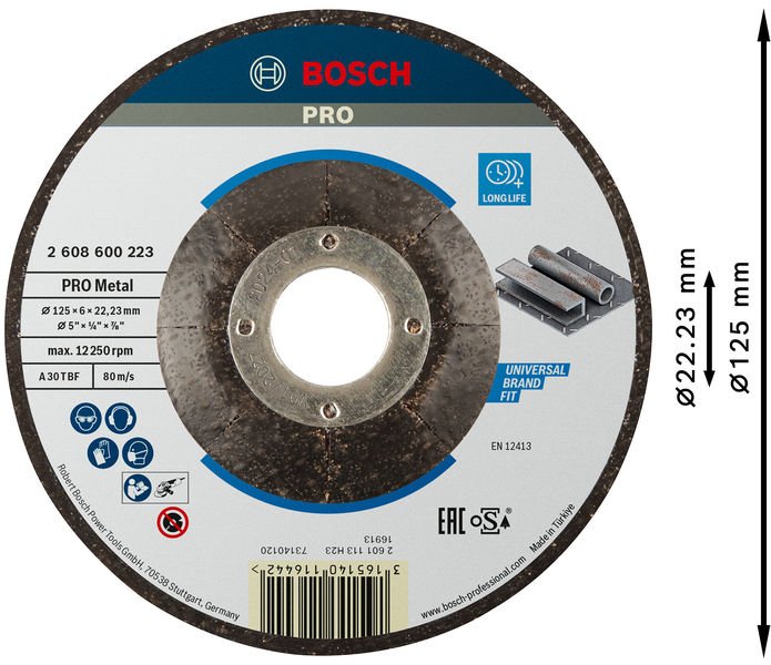 Herausragende Lebensdauer beim Schleifen von Metall! Robuste Aluminiumoxid-Körner für lang anhaltende Leistung Wir haben die PRO Metal für Metallarbeiter entwickelt, die eine zuverlässige und langlebige Schleifscheibe zum Schleifen von Metall benötigen. Die langlebige PRO Metal Gebundene Schleifscheibe wurde mit hochwertigen Schleifkörnern aus Aluminiumoxid besetzt, um Metall und Stahl effizient zu schleifen. Wir haben die Körner mit funktionellen Füllstoffen kombiniert und sie für Stabilität, Hitzebeständigkeit und zuverlässige Schleifleistung in eine Phenolharzmatrix eingebettet. Ein präzisionsgearbeitetes Glasfasergewebe verstärkt die Scheibe und sorgt für zusätzliche Sicherheit.