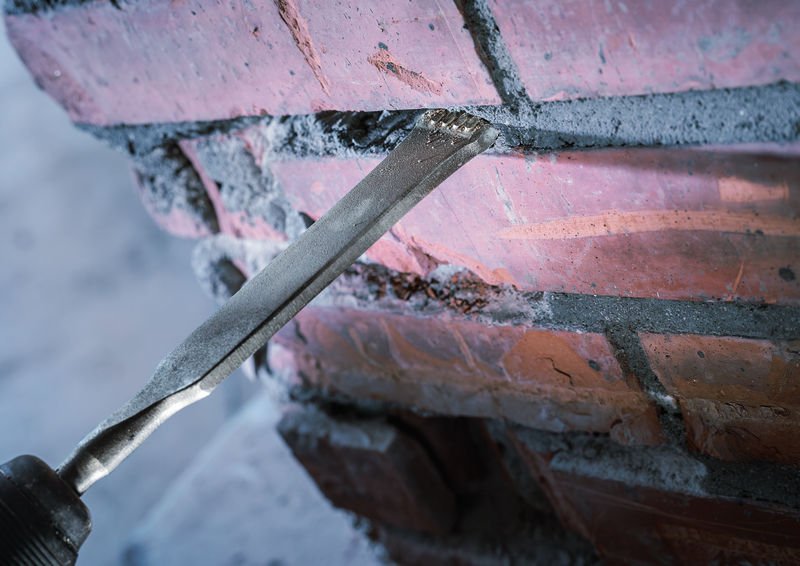 Langlebige Mörtelentfernung! Die Hartmetallspitze ist langlebig und bricht Mörtel effizient auf Bei der Sanierung von Ziegelmauerwerk dürfen die Ziegel nicht beschädigt werden. Wir haben den langlebigen und leicht zu führenden PRO SDS plus-5C Mörtelmeißel mit Carbide-Spitze für Renovierer entwickelt, die Mörtel aus Fugen in Fensterrahmen, Türrahmen und Mauerwerk herausmeißeln müssen, ohne die Ziegel zu beschädigen. Der langlebige PRO SDS plus-5C verfügt über eine Carbide-Spitze, mit der du Mörtel effizient abkratzen kannst. Die Spitze zerbricht den Mörtel zuverlässig und sorgt für eine gute Kontrolle des Meißels. Sie verhindert, dass der Meißel in Mörtelfugen stecken bleibt. Die Ziegel sowie Fenster- und Türrahmen bleiben unberührt.