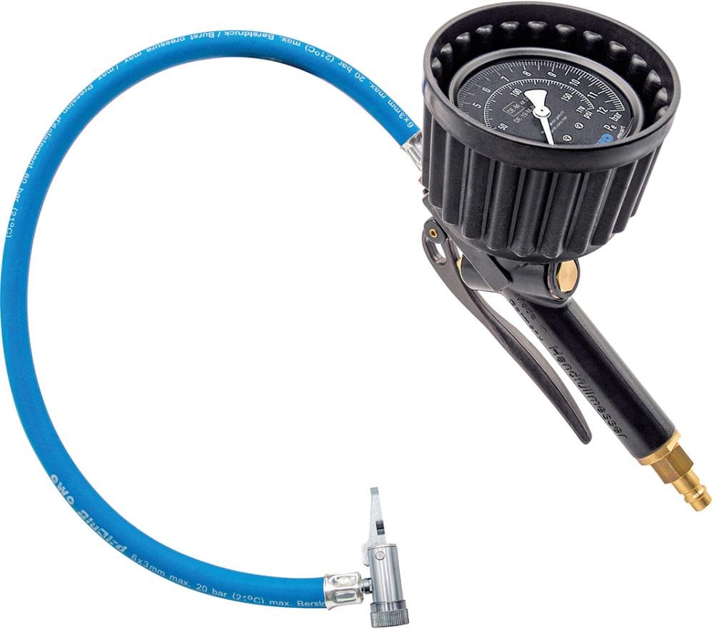 Klassischer Handreifenfüllmesser mit Hebelstecker , typisches Profigerät für Tankstelle und Werkstatt. Auch für Reifengas (Stickstoff) geeignet.