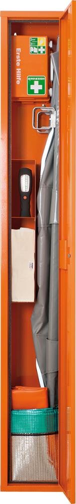 Produktinformationen "Sanitäts-Stehschrank B300xT200xH2000 mm gefüllt mir Trage und Erste-Hilfe-Koffer"