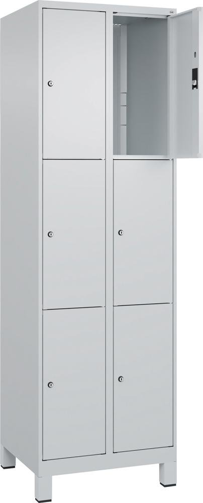 Diese Garderobenschränke verfügen über eine schmale Seitenkante für eine homogene Optik bei der Reihenstellung. Für bessere Belüftung sorgen zusätzliche Lüftungsöffnungen. • Gehäuse: Stahlblech mit hochwertiger Einbrennbeschichtung • Türen: verstärkt, rechts angeschlagen mit Anschlagdämpfer, Lüftungsschlitzen oben/unten und Etikettenrahmen • Verschluss: Sicherheits-Drehriegelverschluss für Vorhängeschloss • Innenkonzept: pro Abteil 1 fest verschweißter Ablageboden, darunter stabile Garderobenstange mit 3 verdrehsicheren Doppel-Schiebehaken (Tragkraft pro Stange 40 kg, pro Doppelhaken 15 kg) • Leichte Reinigung, Abteilboden glatt, auskehrbar • Lackierung: RAL 7035 lichtgrau (weitere Farben in Ein- oder Zweifarblackierung lieferbar) Untergebauter Sitzbank: • Sitzleisten: aus Kunststoff, lichtgrau, mit verzinktem Stahlkern (hygiene- und reinigungsfreundlich) • Sitzbankgestell: 420 mm hoch, Vierkantrohr in schwarzgrau, mit Niveauausgleich 10 mm • Sitzhöhe: 450 mm • Sitztiefe: 315 mm • Bank und Schrank getrennt zur einfachen Selbstmontage