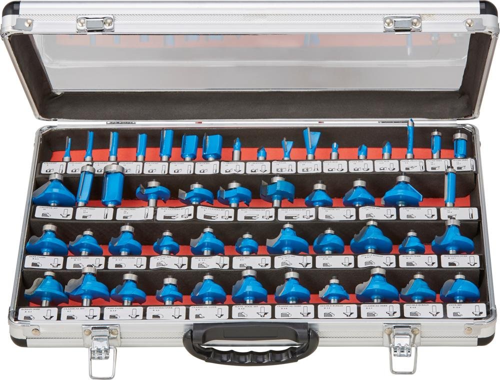 15-teiliges HM-Fräser-Set (1/4" mm Schaft) Inhalt: 2 Abrundfräser mit Kugellager:Ø 21,8, R 6,3, L 13,5 mm;Ø 28,1, R 9,5, L 16,5 mm1 Laminat-Bündigfräser: Ø 12,7, L 13 mm1 Falzfräser: Ø 22,2, L 12,7 mm1 Fasefräser: Ø 31,5 / Winkel 45°, L 15 mm2 Hohlkehlfräser: Ø 9,5, R 4,8, L 9,5 mm;Ø 12,7, R 6,3, L 12,7 mm;Ø 21,8, R 6,3, L 13 mm4 Nutfräser: Ø 6/10/12/16, L 20 mm1 Kantenformfräser mit Kugellager:Ø 25, R 4,5, L 16,3 mm1 V-Nutfräser: Ø 12,7 / Winkel 90°, L 12,7 mm1 Zinkenfräser: Ø 12,7 / Winkel 14°, L 11,8 mm1 Hohlkehlenfräser