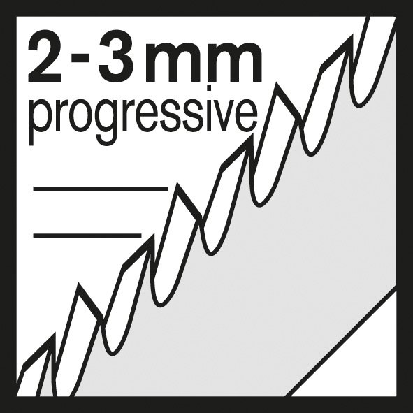 Das T 234 X Progressor for Wood Stichsägeblatt für den Gebrauch bei dickem oder dünnem Holz macht saubere gerade Schnitte. Die Zahngeometrie mit progressiv ansteigender Zahnteilung ermöglicht den Gebrauch bei Materialien mit unterschiedlichen Dichten. Die Kombination des Kegelschliffkörpers, der präzisionsgeschliffenen Zähne und der mehrfach geschliffenen japanischen Zahngeometrie ermöglicht sauberes Schneiden. Das Blatt aus Kohlenstoffstahl ist zum Schneiden von Weichholz und nicht-abrasiven Holzwerkstoffen geeignet. Es ist mit einer mittleren progressiven Zahnteilung (2-3 mm) und einer großen Länge (117 mm) ausgestattet, um eine breite Vielzahl an Holzwerkstoffen mit einer Dicke von 3-65 mm zu schneiden.