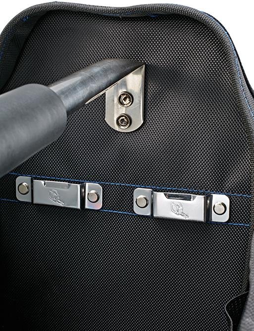 • 1 Außenfach für große Werkzeuge, z. B. Rohrzange, Handsäge oder Wasserwaage, verschließbar mit Reißverschluss und Riemen mit Klettverschluss